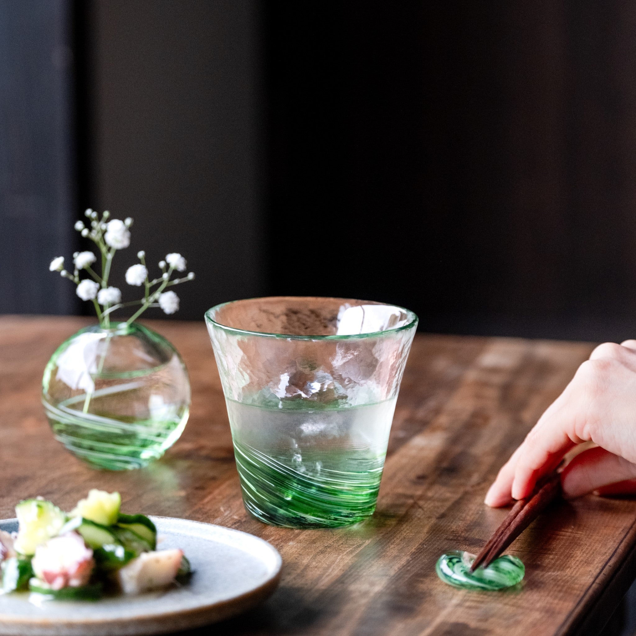 グラス、小鉢、箸置き、一輪挿しとカテゴリーが充実しており、同じ色合いのアイテムをあわせてお使いいただくことで、食卓に落ち着きのあるシックな色合いが広がります。