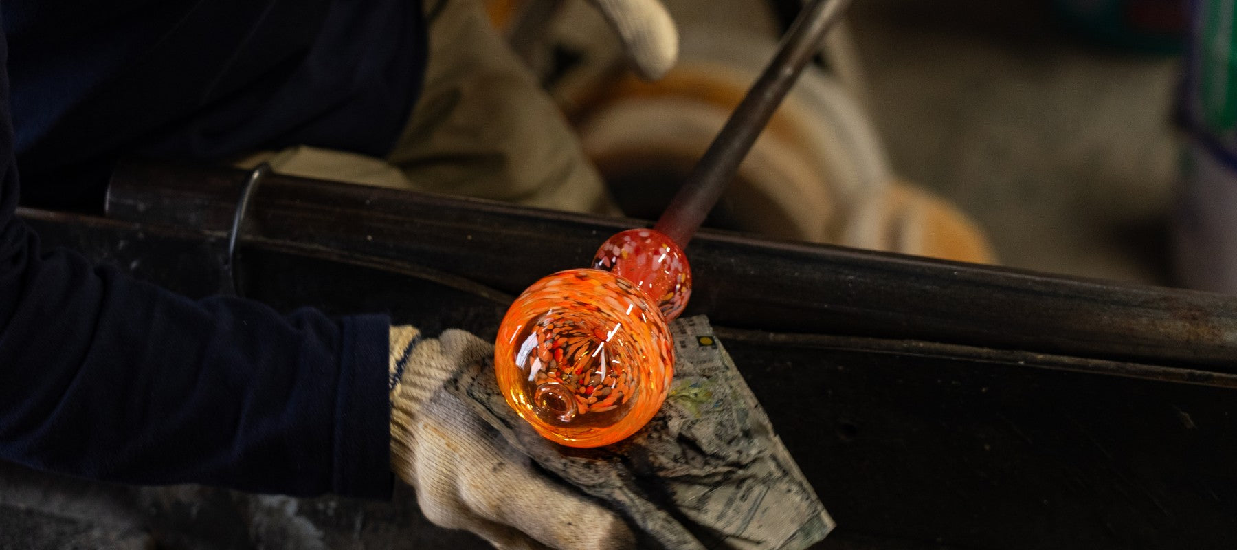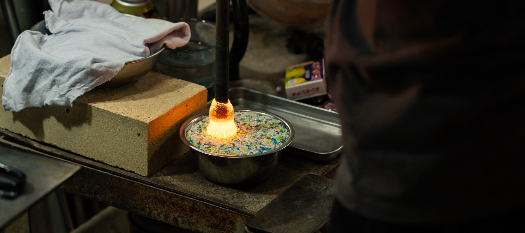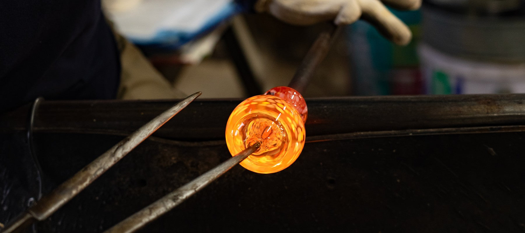 1500℃の坩堝の前で、ガラスをかたちにしていく。