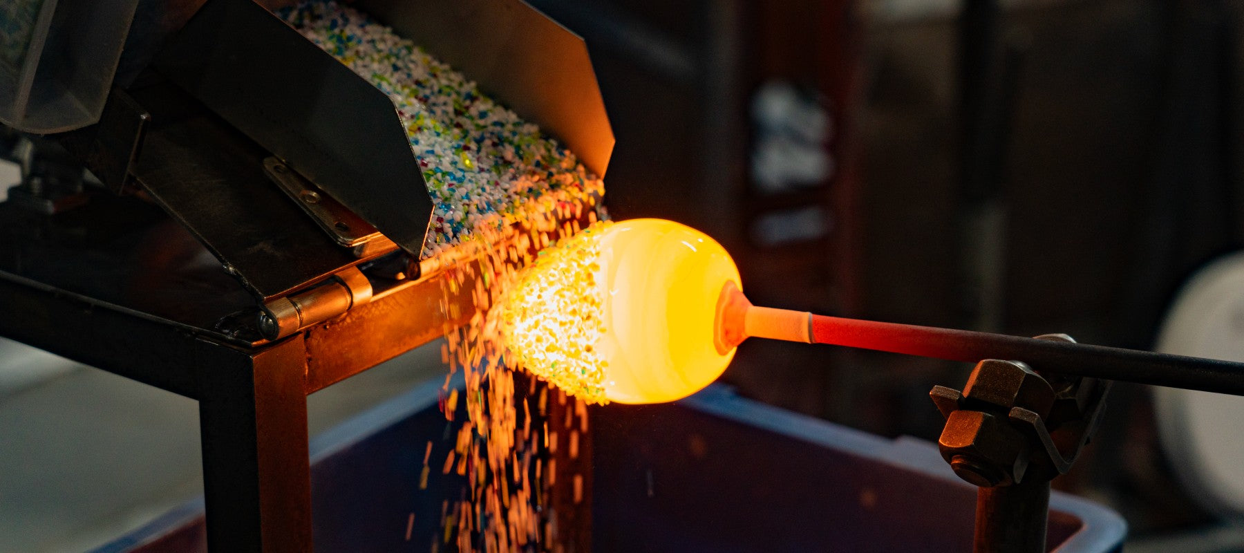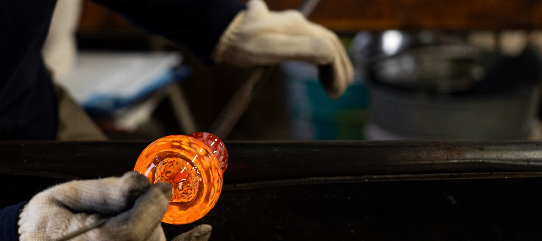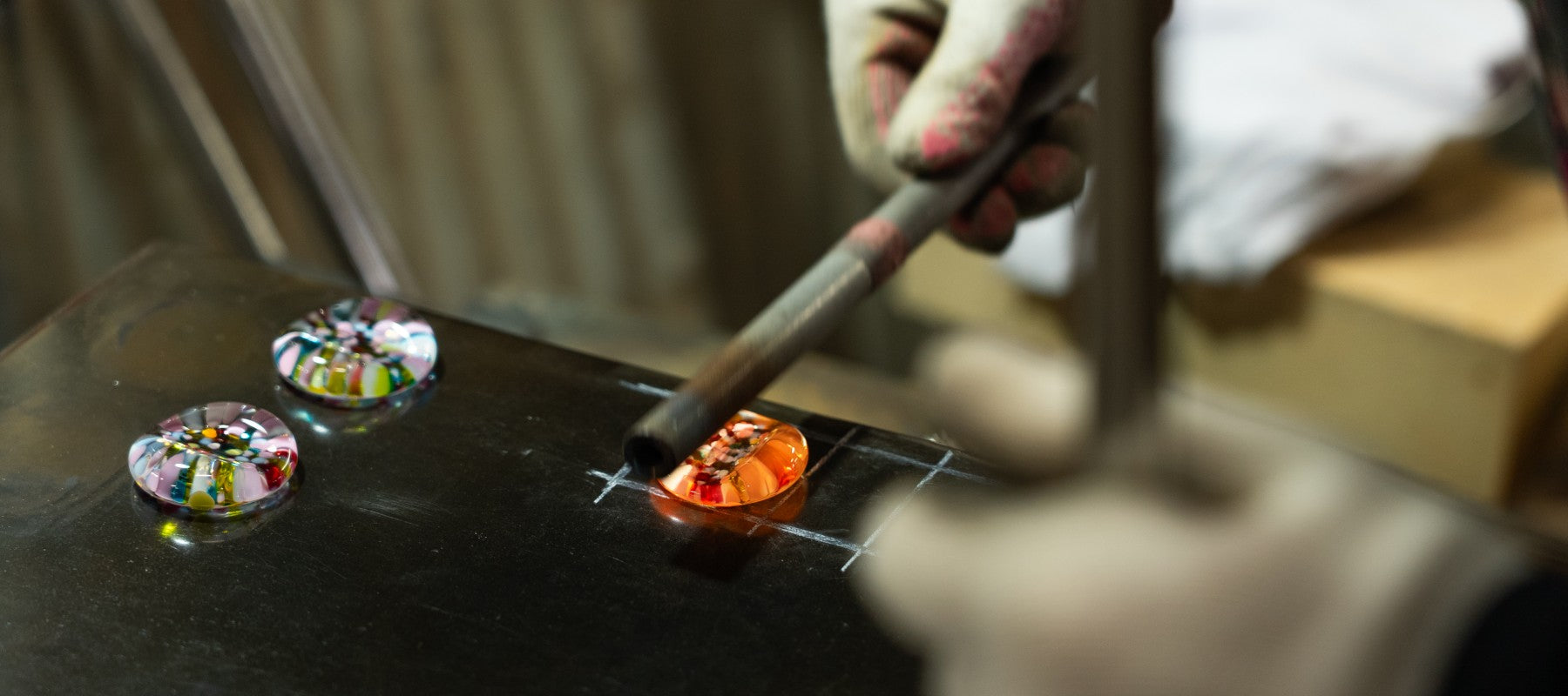 1500℃の坩堝の前で、ガラスをかたちにしていく。