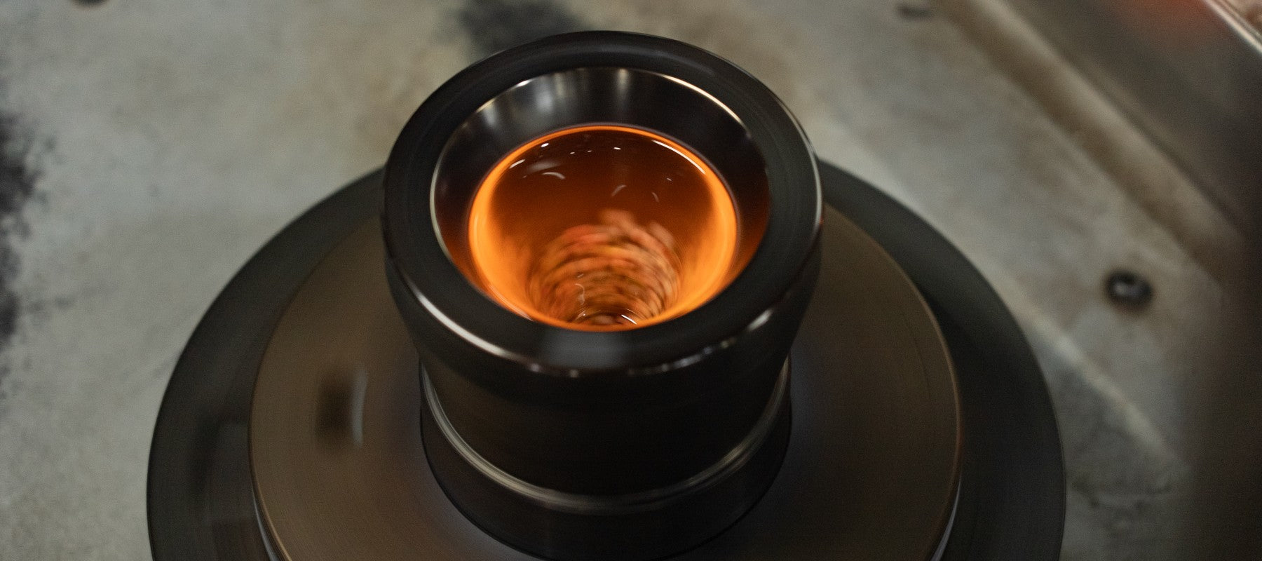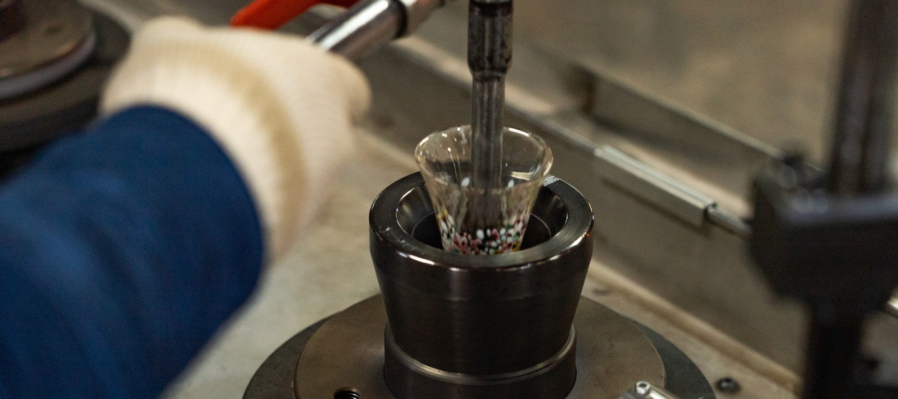 溶けたガラスを金型に落とし、高速で回転させることで、遠心力によって均一に広げていきます。