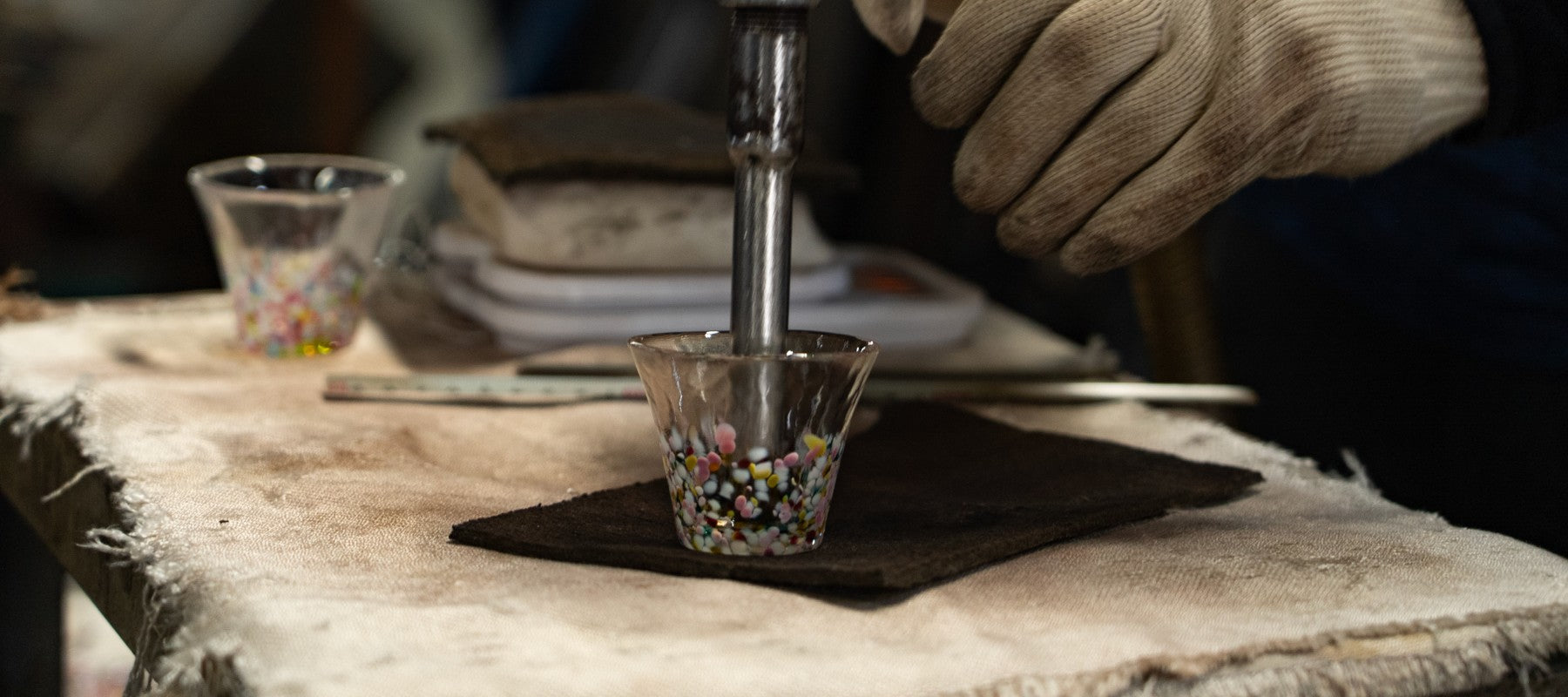 溶けたガラスを適量棹にとり、箸を置くくぼみをつけ、ひとつずつ丁寧に整えていきます。
